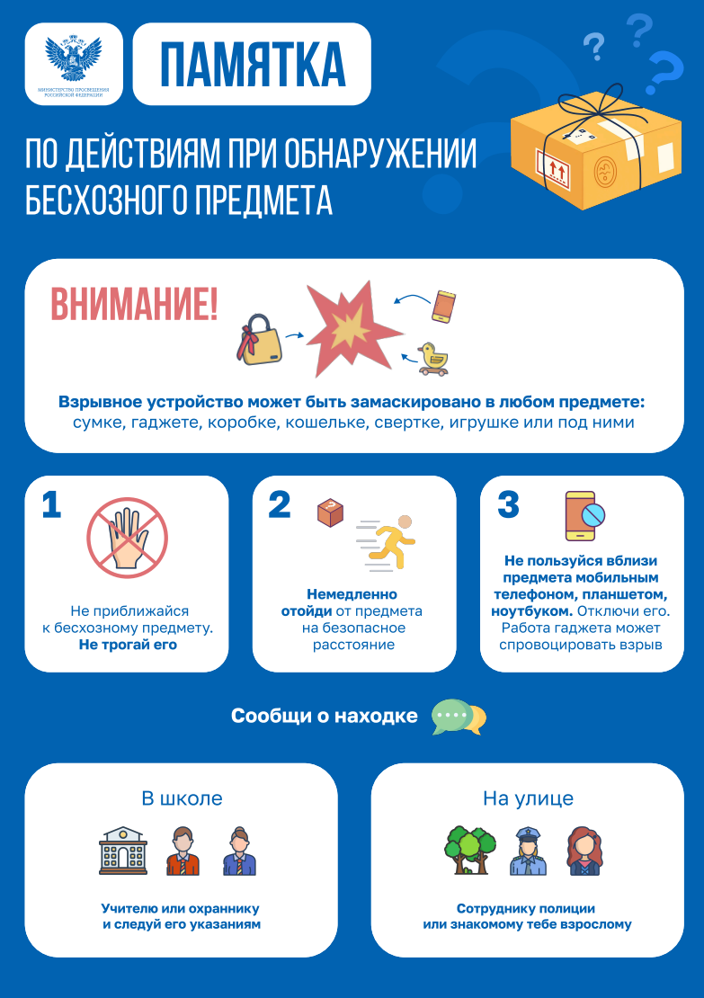 Сообщи о находке: если ты в школе – учителю или охраннику и следуй его указаниям, если ты на улице – сотруднику полиции или знакомому тебе взрослому.