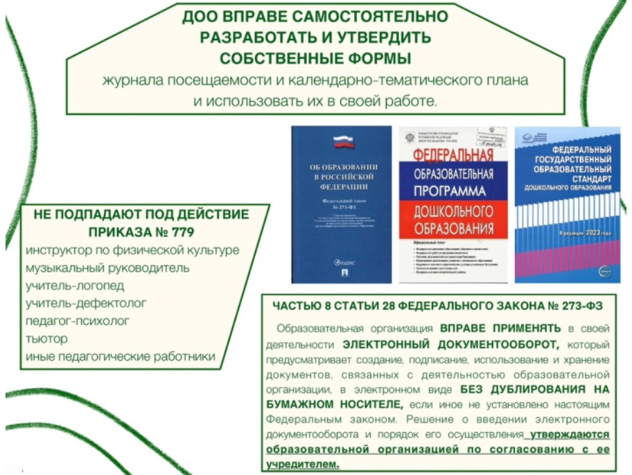 Согласно Приказу Министерства просвещения Российской Федерации от 06.11.2024 № 779 "Об утверждении перечня документов, подготовка которых осуществляется педагогическими работниками при реализации основных общеобразовательных программ, образовательных программ среднего профессионального образования" (Зарегистрировано 04.12.2024 № 80454), для заполнения оставлен только необходимый перечень документов, который напрямую связан с ведением воспитательно-образовательного процесса: календарно-тематический план и журнал посещаемости. Также изменились нормы, регулирующие объём документарной нагрузки на педагогов. Принятые поправки в закон «Об образовании» устанавливают, что педагоги не обязаны готовить отчёты за пределами перечня, утверждённого Минпросвещения, а электронный документооборот не должен дублироваться в бумажном виде.